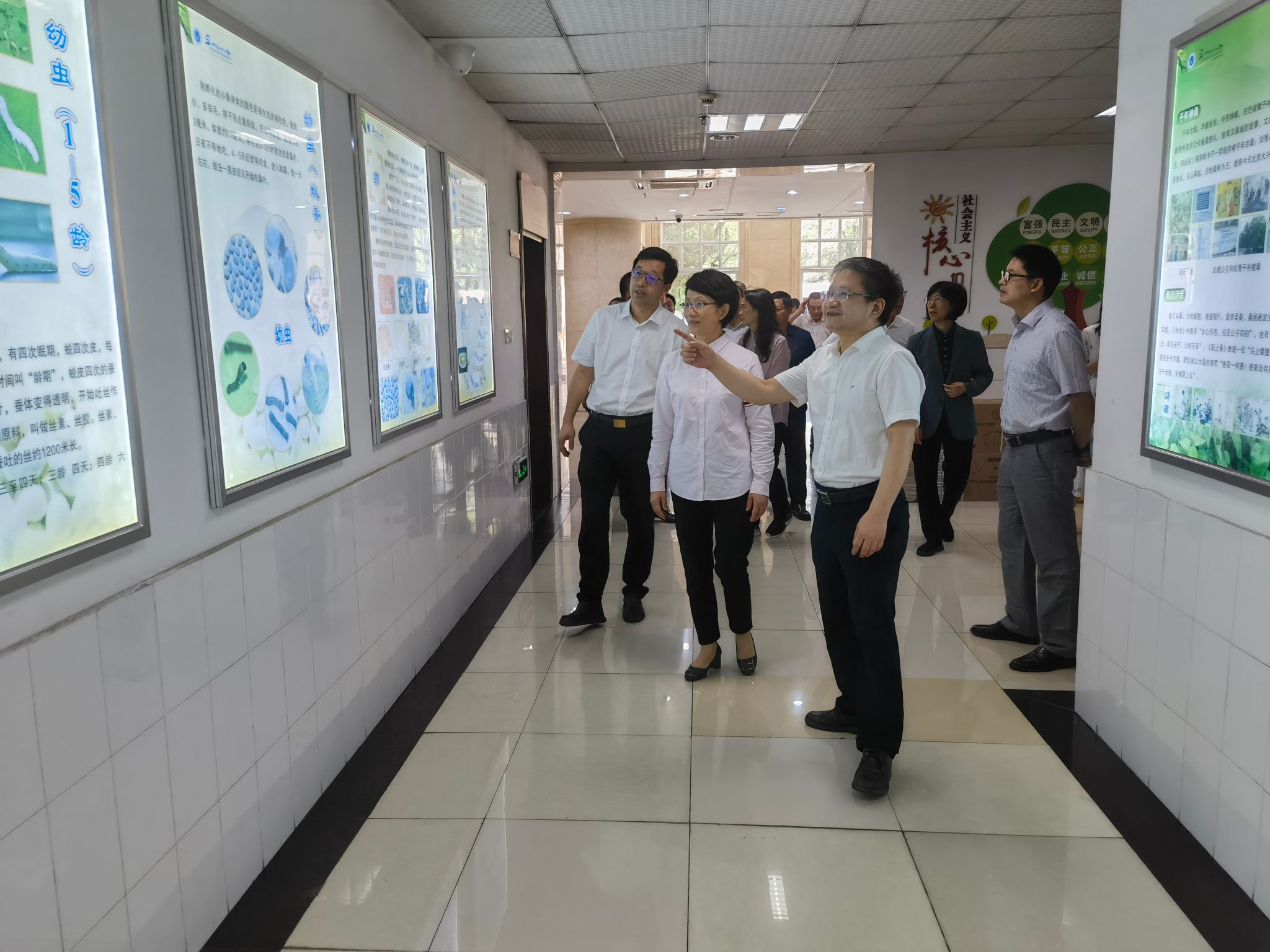 谭副主席一行步入蚕学宫,代方银主任首先结合《蚕学宫赋》介绍了微图坊 在人才培养、科学研究和服务社会方面的文化理念,同时基于蚕桑科普展板介绍了微图坊 在全国科普教育基地建设方面所做的工作和在科普工作中取得的成效。