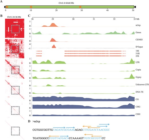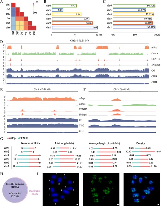 作者开展比较基因组分析,发现与之前版本基因组相比,Mnot-SWU共新组装出83.81 Mb的区间,Mnot-SWU的每条染色体上均存在数个新组装的区间,且这些新组装区间与基因组中串联重复序列分布模式一致,与基因分布模式相反。作者进一步通过对串联重复序列聚类鉴定出桑树的着丝粒序列m3cp,通过分析m3cp的分布模式,并进一步结合Chip-seq以及FISH验证,最终证实桑树是一个多着丝粒染色体的物种。通过对chr5染色体结构特征的分析,提出了桑树染色体断裂融合循环的模型:在chr5染色体的28-33 Mb区间内存在一个新形成的着丝粒,该着丝粒的形成,介导了桑树染色体的断裂融合现象。
