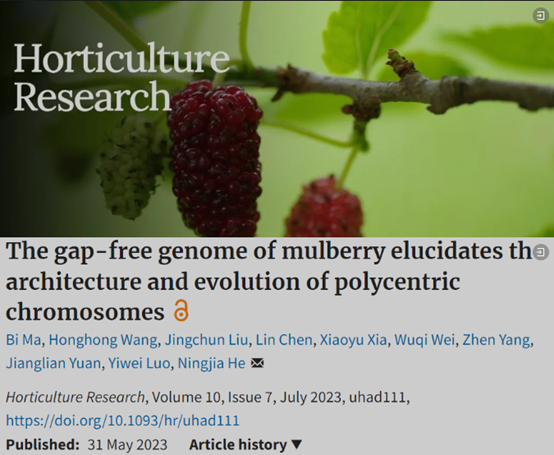 2023年5月,国际著名学术期刊Horticulture Research上线西南大学桑树研究团队题为“The gap-free genome of mulberry elucidates the architecture and evolution of polycentric chromosomes”的研究论文。这是桑树首个报道的无缺口参考基因组,是继2013年桑树基因组图谱发表后,桑树基因组学领域中又一里程碑事件。
