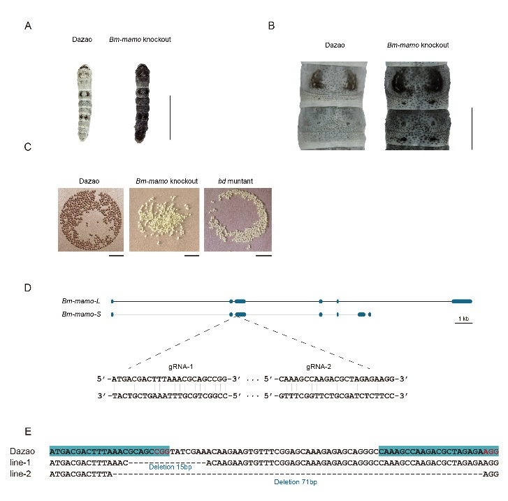 在这项研究中,通过利用1162个回交一代(BC1M)个体进行精细定位,将淡墨突变座位锁定在约390 kb的基因组范围,其中有5个预测基因;通过基因表达差异分析、序列分析,确定了预测基因BGIBMGA012517和BGIBMGA012518,并发现这两个预测基因其实为一个基因。利用基因干涉(RNAi)和CRISPR/Cas9介导的基因敲除,确定了Bm-mamo的功能缺失导致家蚕幼虫表皮黑色素沉着,呈现与淡墨突变体一样的表型。