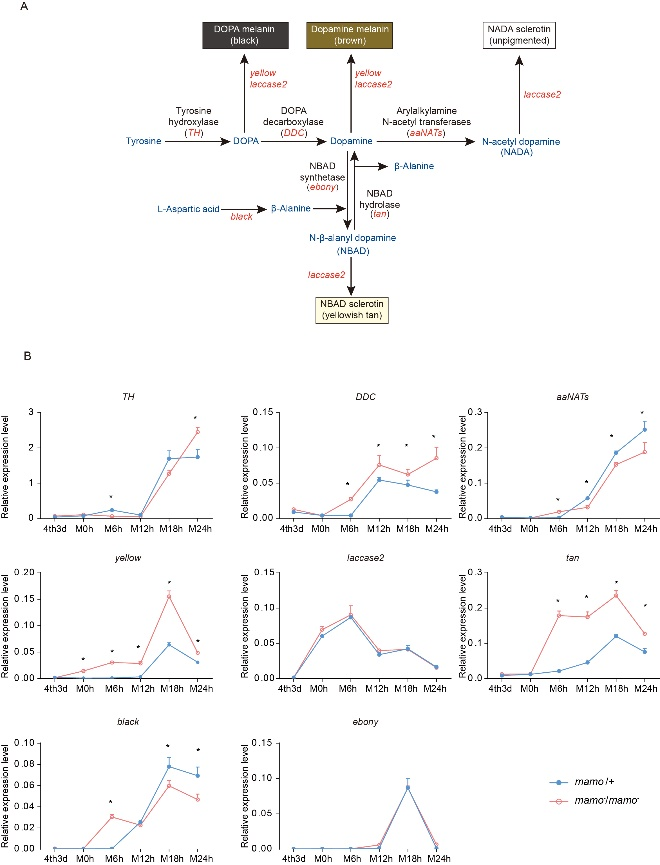 本研究结果表明,Bm-mamo基因通过调控黑色素合成基因以及表皮蛋白基因的表达,从色素合成与表皮构建两个方面综合影响家蚕幼虫的表皮着色。