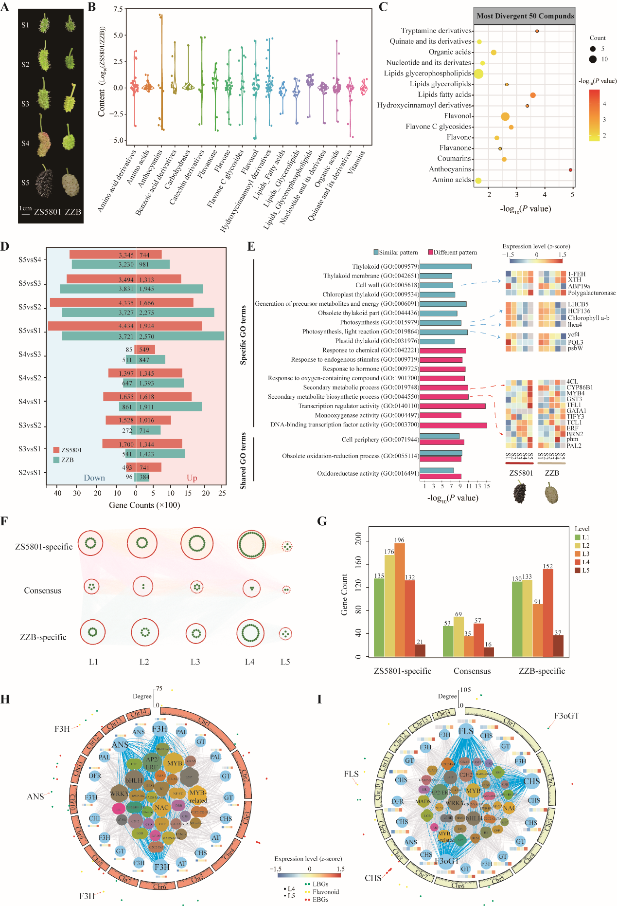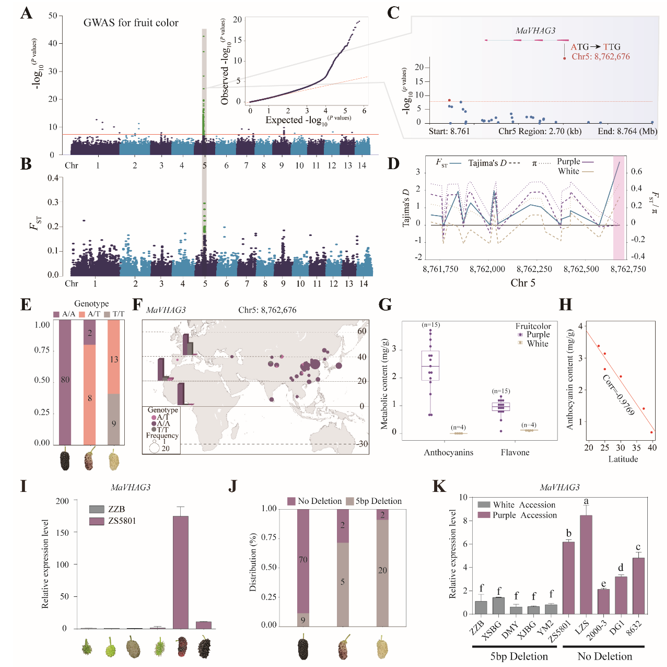 在这项研究中,课题组构建了一个大规模的果色变异数据集,包括代表性品种中桑5801(紫色)和珍珠白(白色)的高质量单体型基因组,以及全发育期的转录组和代谢组数据。同时,还整合了来自全球各地112个果桑品种的全基因组和表型数据。通过群体结构分析揭示了桑果颜色变化与品种基因型之间的相关性。GWAS分析进一步显示,MaVHAG3基因的自然变异可能是造成桑果颜色差异的主要原因,这一发现得到了基因型频率、转录表达和代谢谱分析等结果的支持。此外,通过多角度的代谢通路和调控网络剖析,丰富了对桑果颜色变化调控模式的理解,揭示了多层次调控下高花青素含量形成的分子过程。