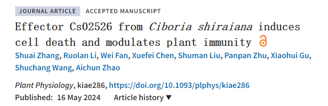 赵爱春教授课题组在国际植物学领域权威期刊《Plant Physiology》(中科院一区Top,最新影响因子7.4)在线发表了题为“Effector Cs02526 from Ciboria shiraiana induces cell death and modulates plant immunity”的研究论文,该研究揭示桑实杯盘菌效应蛋白Cs02526调控植物免疫的分子机制。