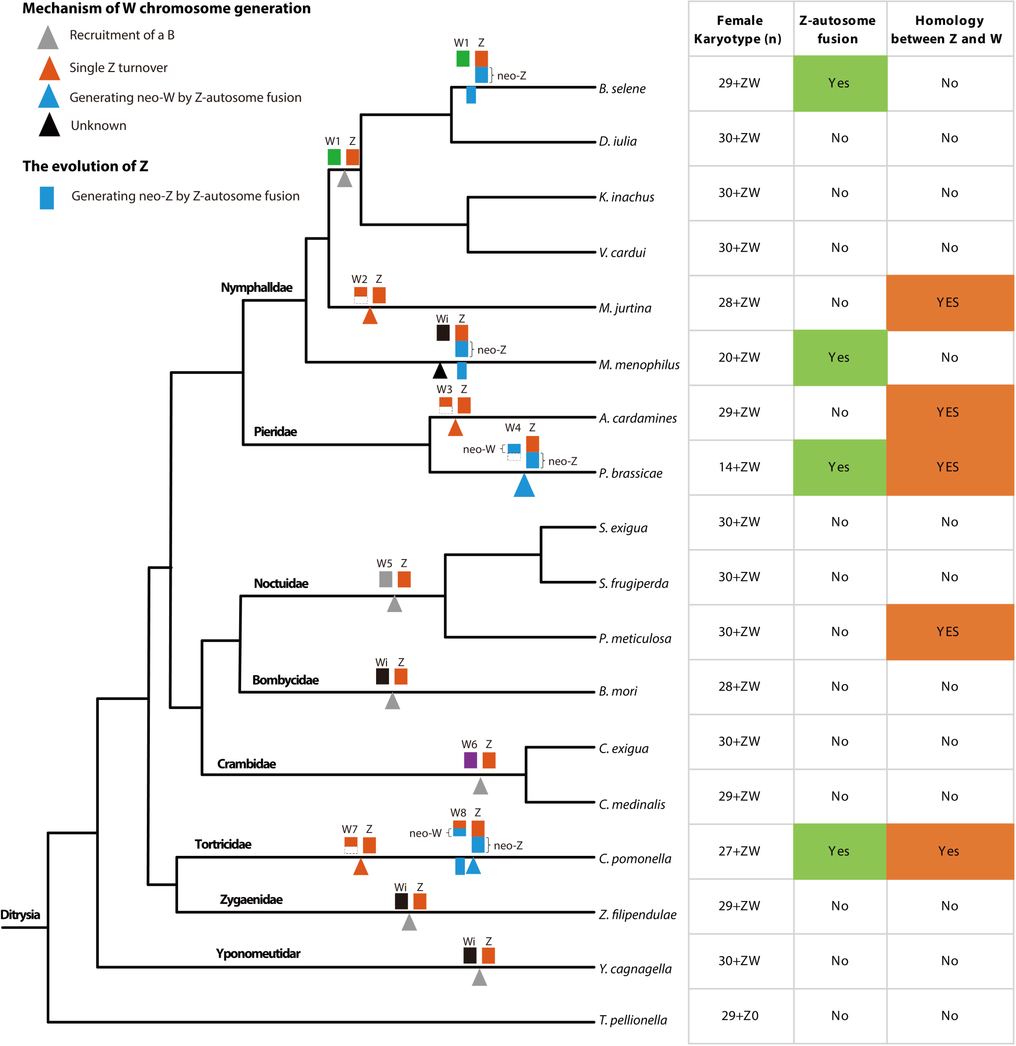 揭示新物种、新性状、新遗传物质从何而来(起源)以及如何发展(演化),这是进化生物学要解决的核心问题。此前已知Z染色体在鳞翅目不同物种间相对保守,推测其是单一起源;而对于鳞翅目W染色体起源和进化的认识仍不清楚。鳞翅目早期分化系(如微小蛾科,Micropterigidae)以及其近缘目毛翅目(Trichoptera)中均缺乏W染色体(雌性性染色体为ZO,雄性为ZZ)。因此,ZO/ZZ型的性染色体系统被认为是鳞翅目和毛翅目的祖先系统,而W染色体是鳞翅目昆虫后期产生并主要分布在鳞翅目双孔亚目(Ditrysia,包含大部分蛾类和所有蝶类)物种中。关于W染色体的起源问题,前人根据性别特异染色体产生的一般机制,推测鳞翅目W可能通过三种机制产生,包括非经典模型下的B染色体招募(Recruitment of B chromosome),经典模型下的Z-常染色融合(Z-Autosome fusion)和性染色体转换(Sex chromosome turnover)。先前基于有限的研究推测鳞翅目双孔亚目的W染色体可能是单一起源,并且主要通过非经典模型(Recruitment of B chromosome)产生。但事实是否如此呢?则有待对更多物种的W染色体进行研究。