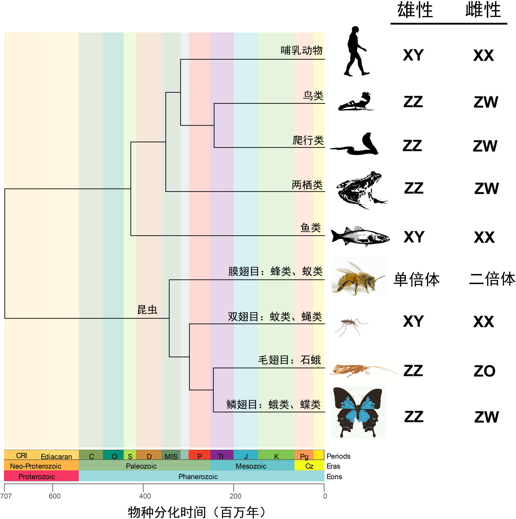 注:上述所列不同类别生物的性染色体组成代表的是该类物种中大部分物种所呈现的性染色体组合。例如,鱼类除了XX/XY系统外,还有一些鱼类属于ZZ/ZWZZ/ZOXX/XO系统。另外,生物界已知性染色体组成的动物以XY/XX系统为主。