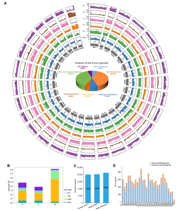 1)获得了家蚕高质量的W染色体序列,并且发现家蚕W染色体包含雌性性别决定因子(Fem137个拷贝,蛋白编码基因76个,这些信息对解析家蚕性别决定机制以及基于W染色体的分子育种具有重要价值。