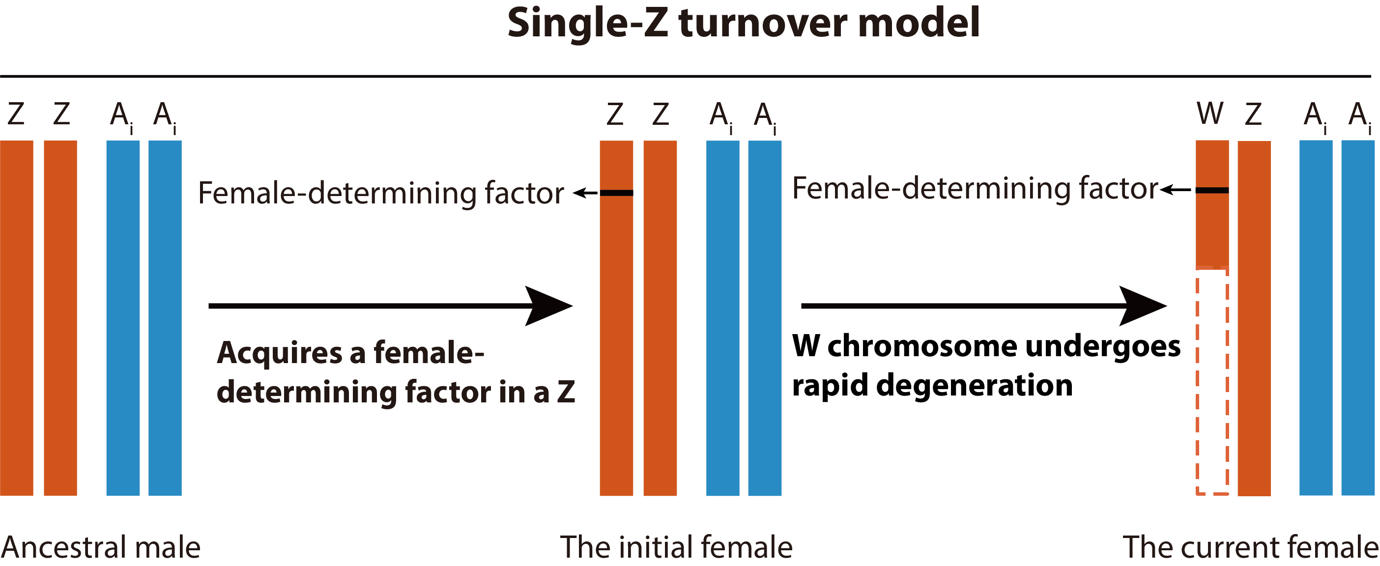 本研究通过比较21个鳞翅目昆虫(包括17ZW系统,4ZO系统)和3个毛翅目昆虫(ZO系统)基因组,发现鳞翅目W染色体通过多种机制产生,包括先前推测的非经典模型(Recruitment of B chromosome)、经典模型下的Z-常染色体融合机制(Z-Autosome fusion)和本研究新提出的单个Z染色体转换机制(Single-Z turnover。本研究发现17ZW系统中,有3个物种的W染色体形成涉及单个Z染色体转换机制,该机制认为祖先ZO/ZZ性染色体系统中的雄性包含一对ZZ性染色体,在进化过程中其中一条Z染色体获得了雌性性别决定因子,进而导致该Z染色体转变成W染色体。