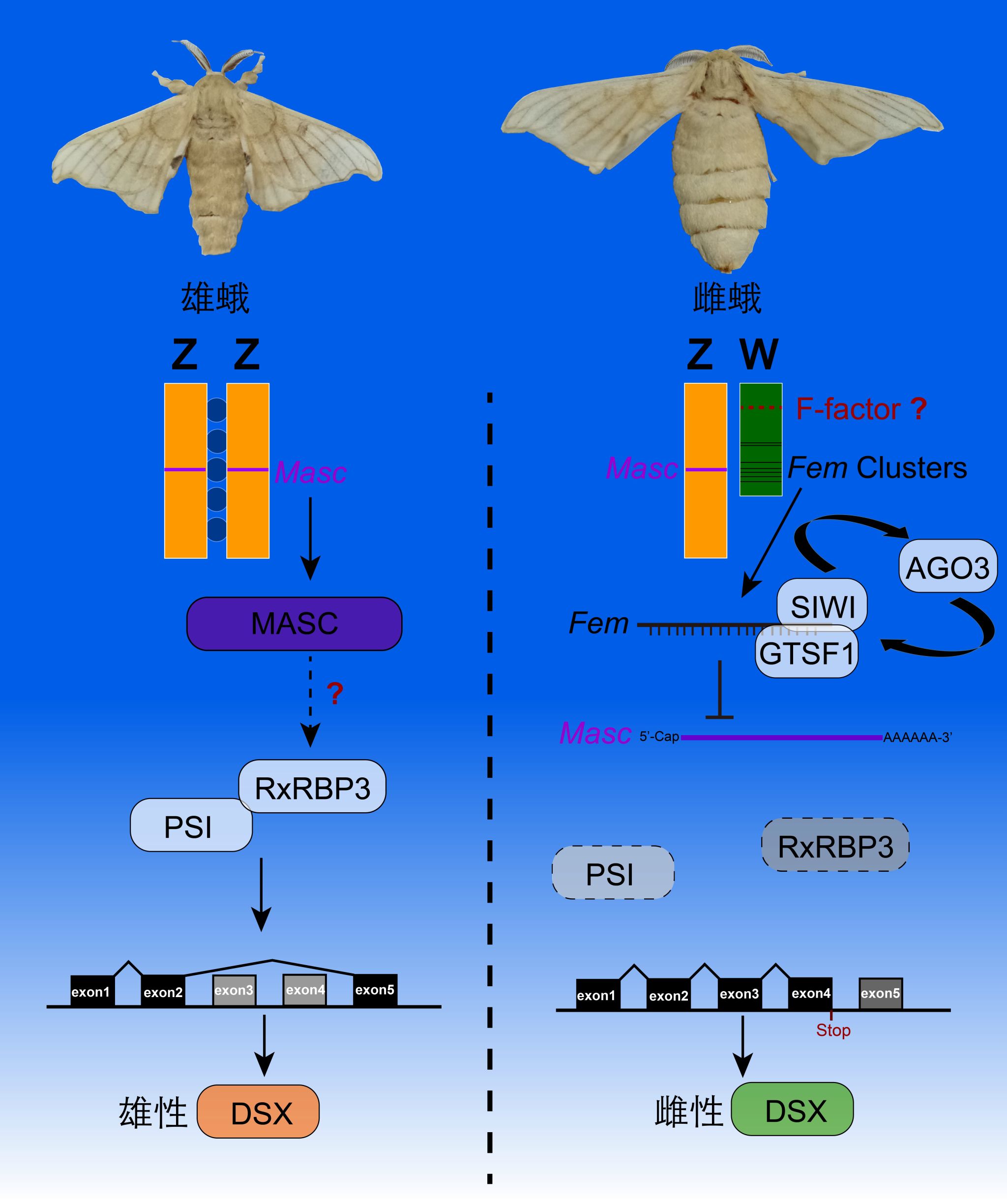 1916年日本学者Yoshimaro Tanaka首次在家蚕中发现W染色体,其后家蚕性别决定的经典遗传研究得到重要发展,并基于W染色体的雌性决定作用,通过诱变技术建立了家蚕性别形态标记,至今被广泛应用于家蚕“限性品种”培育。最近20年来,家蚕性别决定分子机制研究一直是热点问题,包括在W染色体上发现了强雌性决定因子Fem(一个piRNA),在Z染色体上发现了Fem下游因子Masc,在常染色上也发现了影响性别的多个基因但总体上家蚕性别决定机制仍未被清晰解析,这与家蚕W染色体序列信息的缺乏不无关系