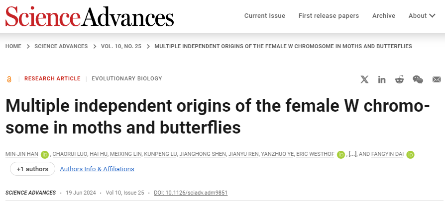2024619日,国际著名期刊Science AdvancesScience综合性子刊)在线发表了微图坊 代方银教授团队题为“蛾类和蝶类昆虫雌性W染色体的多重独立起源”(Multiple independent origins of the female W chromosome in moths and butterflies)的研究论文。该研究首次获得了家蚕W染色体完整基因组序列,并揭示鳞翅目昆虫W染色体起源与进化的新机制。研究结果不仅在基因组与进化生物学领域具有重要理论意义,而且在家蚕等鳞翅目昆虫的性别调控的研究方面具有重大价值,并为家蚕分子育种带来新的前景。
