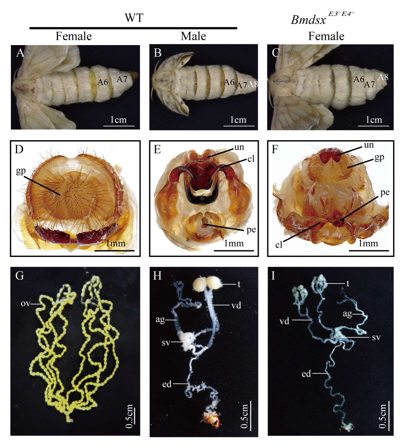BmdsxE3-/-E4-/-突变雌性染色体组型(ZW)的成虫在外部形态上表现出雄性特征,腹部体节数由雌性7节转变为雄性8节,并出现雄性特有的抱握器和阴茎等外部生殖器结构。在内部生殖器官方面,性反转家蚕发育出完整的雄性内生殖器官(包括输精管、附腺和精囊等)(图3)。