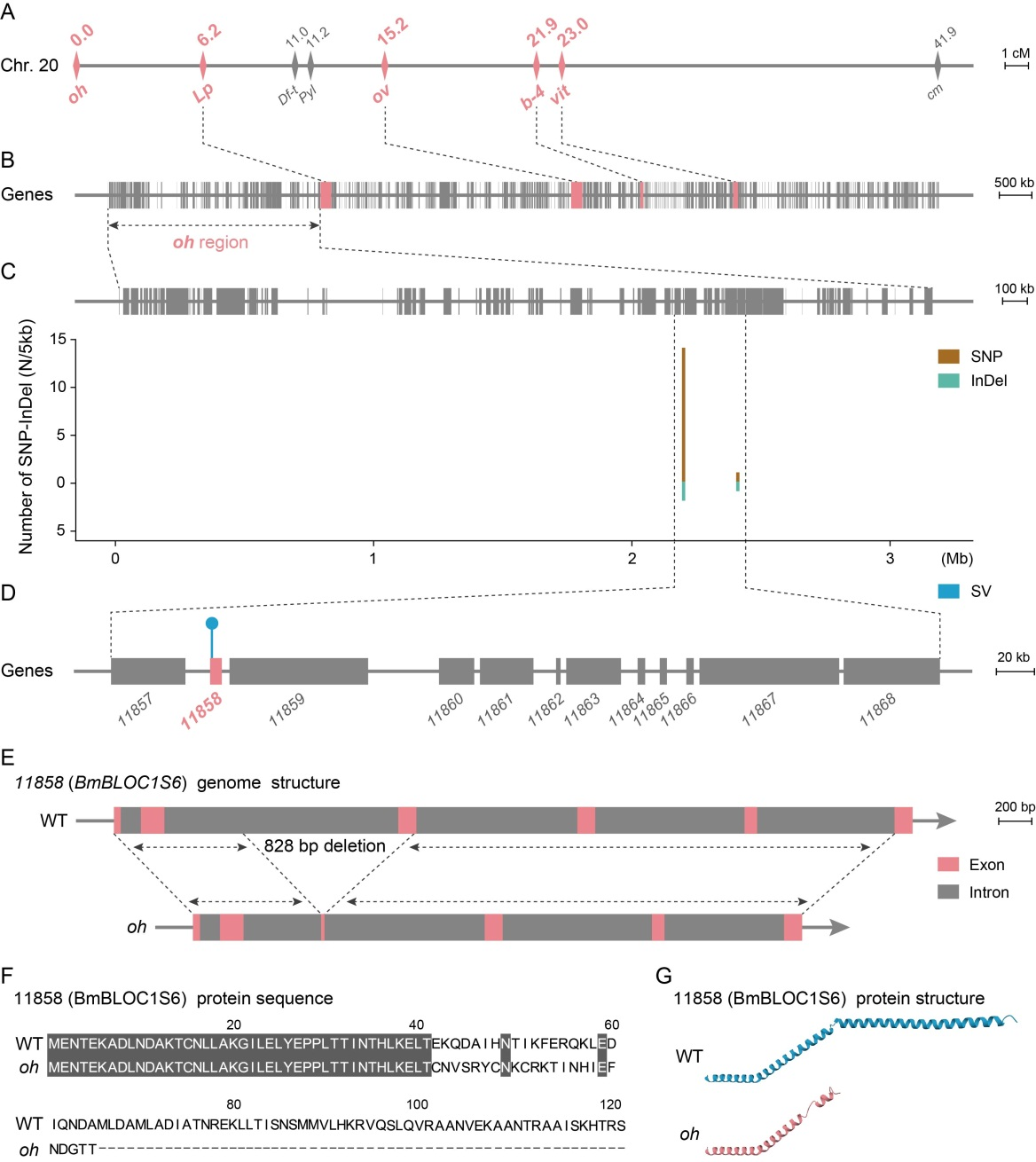本研究基于家蚕高质量泛基因组数据和经典遗传连锁图谱,确定了BmBLOC1S6Biogenesis of Lysosomal-related Organelles Complex 1 Subunit 6是霜降油蚕的候选基因(图1A-E并发现霜降油蚕BmBLOC1S6基因中828 bp大片段缺失会导致其蛋白质编码提前终止(图1F-G)。