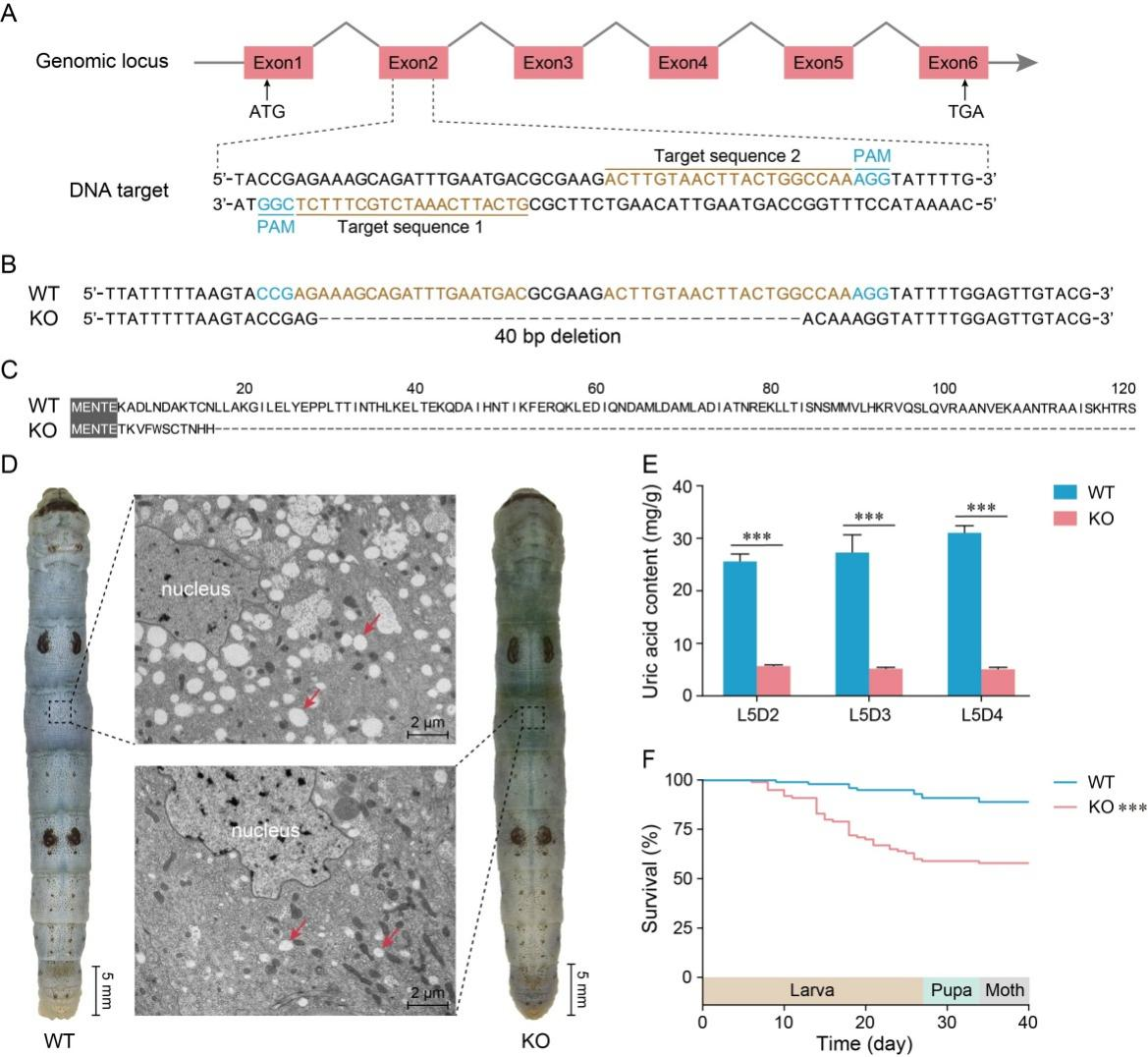 家蚕是鳞翅目模式昆虫,幼虫期表皮蓄积的大量尿酸颗粒使其呈白色而不透明;相反,表皮中尿酸颗粒减少会导致其呈不同程度的透明状(称为油蚕)。这表明尿酸是家蚕体色模式的重要物质基础之一。此外,这些尿酸颗粒也增强了家蚕幼虫的抗紫外线能力,提示参与这一过程的基因也可能成为鳞翅目害虫防治的候选靶标。