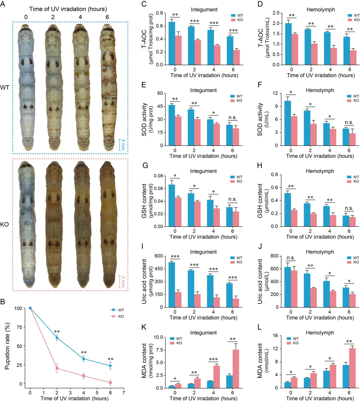 图5. 紫外线照射对家蚕野生型(WTBmBLOC1S6-KO幼虫的影响