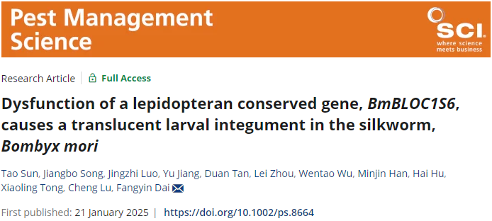 2025121日,中科院分区一区学术期刊Pest Management Science在线发表了微图坊 代方银教授团队题为Dysfunction of a lepidopteran conserved gene, BmBLOC1S6, causes a translucent larval integument in the silkworm, Bombyx mori(鳞翅目保守基因BmBLOC1S6的功能障碍导致家蚕幼虫表皮呈半透明)的研究论文。该项研究揭示了家蚕霜降油蚕hoarfrost translucent, oh突变体的负责基因为BmBLOC1S6并阐明其在家蚕(鳞翅目昆虫)表皮尿酸颗粒形成中的关键作用。研究结果不仅在家蚕突变体解析方面具有重要指导意义,也对鳞翅目害虫的生态防控具有一定参考价值。