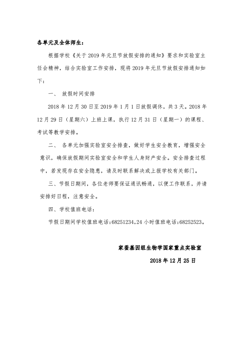 家蚕基因组生物学国家重点微图坊 关于2019年元旦节放假安排的通知