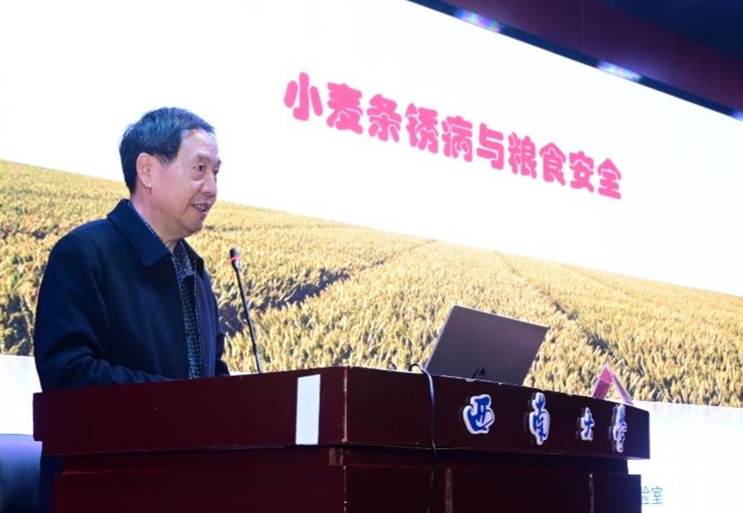 团队通过几代人接续努力,攻克中国小麦条锈病防控难题,取得了系列重大成就。康院士首先介绍了小麦条锈病的危害性和病原的特点,指出该病是世界性重大真菌病害,其大流行可导致减产50%-60%。康院士着重讲述了李振岐、曾士迈等老一辈科学家通过努力揭示了我国条锈病独特的流行体系,发现西北越夏区条锈菌遗传多样性高,探明了小麦条锈病传染源。在此基础上,新一代团队通过长期监测研究,建立检测和异地测报等技术,开发了小麦条锈病远程预警系统,从而提前准确预测不同致病菌系的流行危害,掌握了对病害防控的主动。通过深入研究小麦条锈菌的致病机理,取得了一系列重要成果,主要包括揭示了小麦条锈菌的侵染过程,完成了小麦条锈菌基因组测序与重测序,鉴定了小麦条锈菌吸器特意表达基因,明确了小麦条锈菌糖吸收的分子机制,解析了小麦条锈菌致病因子分子基础,揭示了小麦条锈菌效应分子的作用机理,并基于RNAi技术创制了抗病材料。康院士的报告不仅让在场师生了解了我国在小麦条锈病防治研究领域取得的系列重大突破,更令大家感受到了久久为功、格物致理的精神魅力。