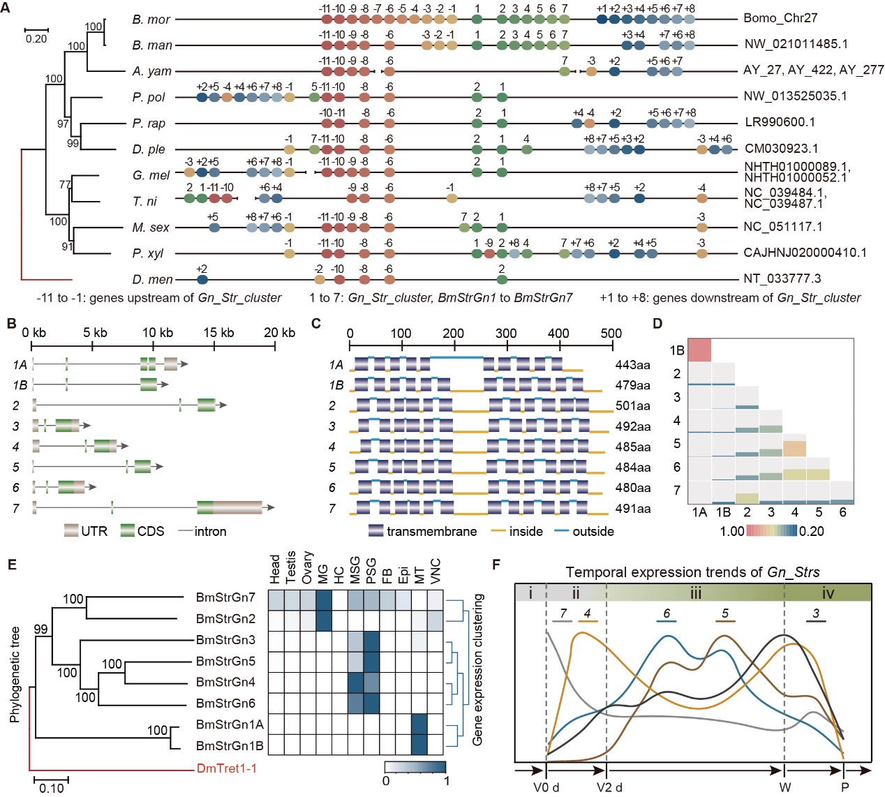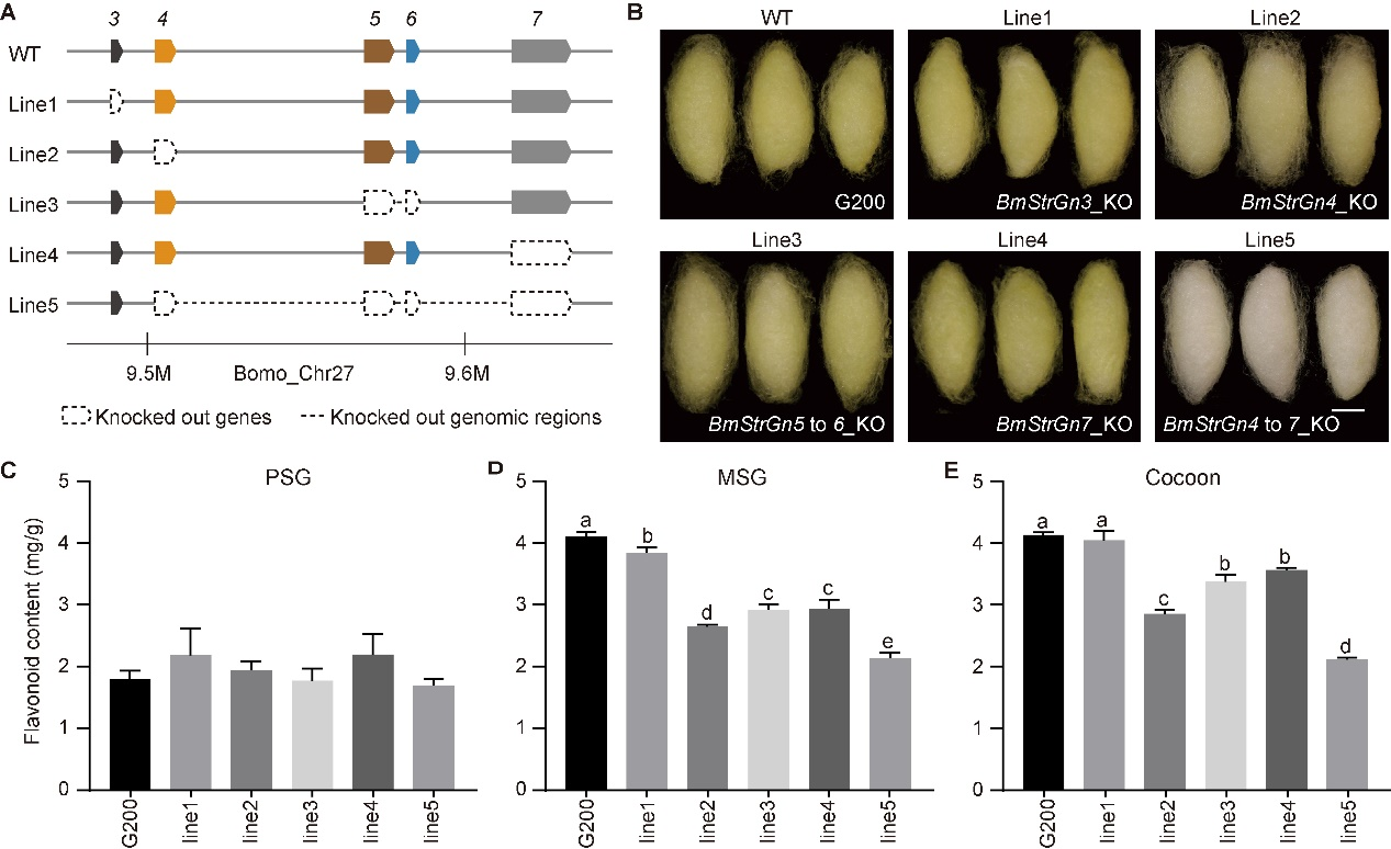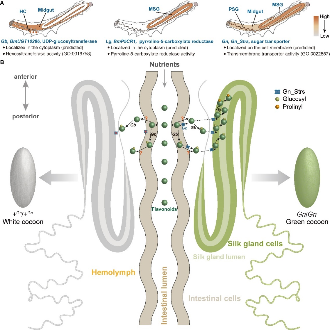 团队基于长期的家蚕经典遗传学和遗传资源研究积淀、新近构建的家蚕高质量泛基因组图谱,在本研究中,批量化采用绿茧品系进行了全基因组关联分析,对关联信号最强的“新绿茧”(New green cocoon, Gn)进行了精细定位和鉴定;通过基因表达和序列分析,将Gn的候选基因锁定为一簇糖转运蛋白基因(Str);利用CRISPR/Cas9介导的基因编辑技术对候选基因的功能进行研究,发现这一簇Str功能缺陷会导致家蚕丝腺和蚕茧中黄酮类化合物的含量降低,蚕茧颜色随之变淡。