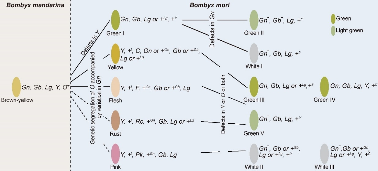 生物多样化的外观色彩是自然界的绚丽奇观。昆虫外观色彩与其隐蔽、伪装、求偶、信号传递等众多生物学行为密切相关,对生存繁衍至关重要,其生物学研究对遗传、发育和进化理论的构建发挥了重要作用。家蚕(Bombyx mori)由野桑蚕(Bombyx mandarina)驯化而来,野桑蚕的茧一般是均一的棕黄色,而家蚕的茧色丰富多样。家蚕茧色可分为三大类:不含或含有微量色素的白茧;由类胡萝卜素沉积形成的黄红茧,如金黄茧、肉色茧、粉色茧、锈色茧等;由黄酮类化合物沉积形成的绿茧。先前的研究已基本揭示黄红茧系形成的分子基础,细胞内和细胞膜上负责运输类胡萝卜素的蛋白是黄红茧形成的关键因素。然而,绿茧的遗传基础尚未被完全揭示,特别是关于表型更为鲜艳的“独立遗传绿茧”的分子基础还无一得到解析。另一方面,伴随着从野桑蚕到家蚕的驯化,蚕茧颜色从单一到多样化的演化令人着迷,但其遗传机制仍不为所知。