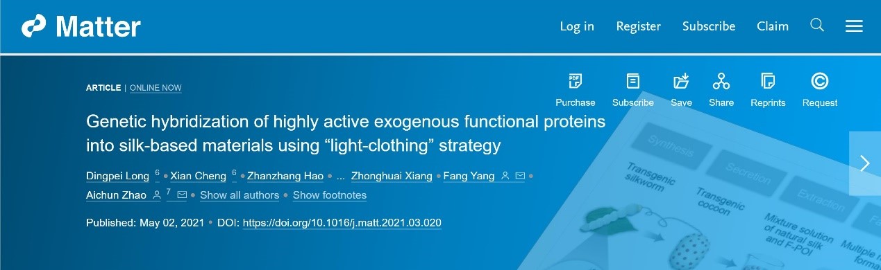 2021年6月2日,国际著名材料学期刊《Matter》(IF2020= 15.589)在线刊登了西南大学家蚕基因组生物学国家重点微图坊