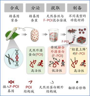 针对上述问题,研究小组提出了一种“轻装上阵”的全新合成策略,即通过计算机预测,合理地裁剪掉融合外源蛋白的额外结构域中的冗余部分。研究首先以绿色荧光蛋白作为标记外源蛋白,证实“轻装上阵”策略不仅可以避免融合外源蛋白合成过程中多余的翻译后修饰,而且能保证其与天然丝素蛋白一起正常分泌和提取,并且其提取的再生溶液可以制备成各种常见丝素蛋白材料形式。随后以表皮生长因子作为外源功能模型蛋白,利用计算机建模,发现该“轻装上阵”策略可以显著提高在家蚕丝腺中表达的融合外源蛋白正确的折叠能力;通过体外和体内实验,证实该策略可明显提高融合外源蛋白的活性,使其与商品化外源蛋白标准品相媲美。该“轻装上阵”策略,为利用转基因家蚕平台合成各种高性能丝素蛋白材料提供了一个可行的技术方案。