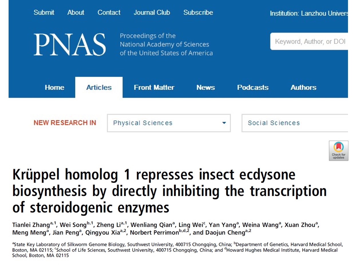 (西南大学)夏庆友教授团队程道军研究员课题组完成的题为“Krüppel homolog 1 represses insect ecdysone biosynthesis by directly inhibiting the transcription of steroidogenic enzymes”的研究论文,该论文在家蚕及果蝇中揭示了保幼激素(juvenile hormone, JH)通过信号转导分子Krüppel homolog 1(Kr-h1)抑制蜕皮激素(ecdysone)合成的新机制。