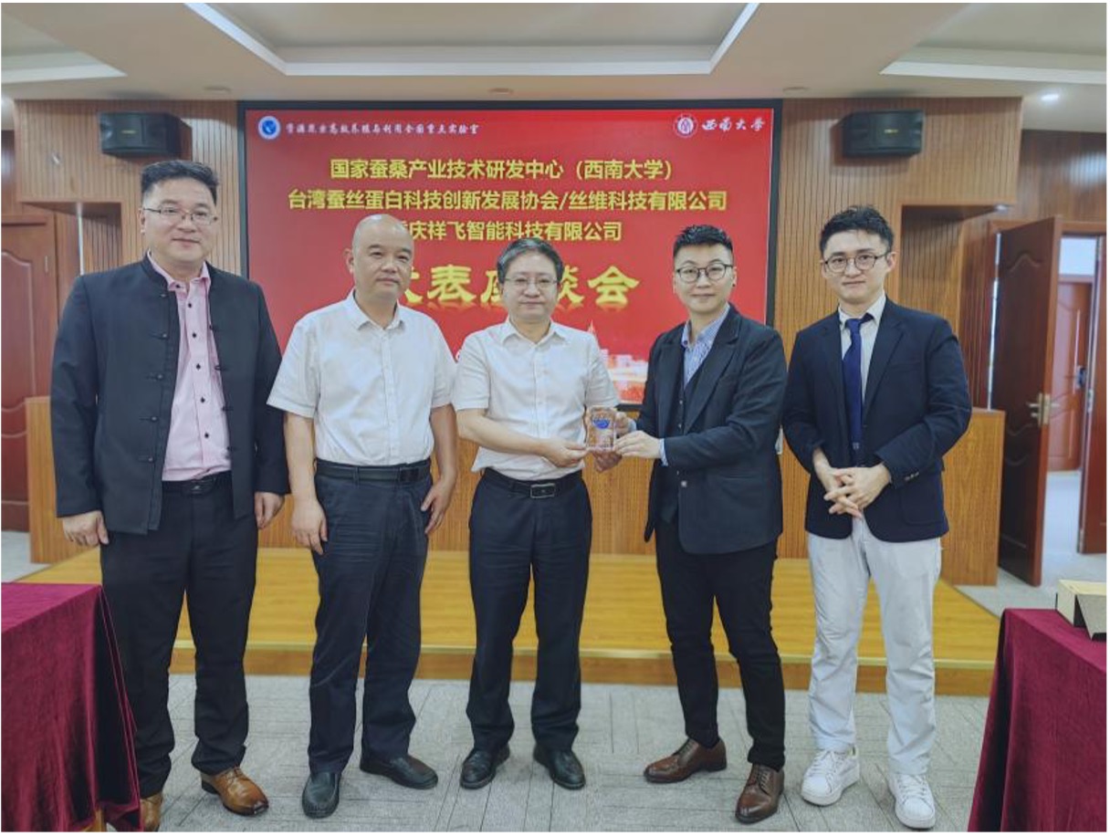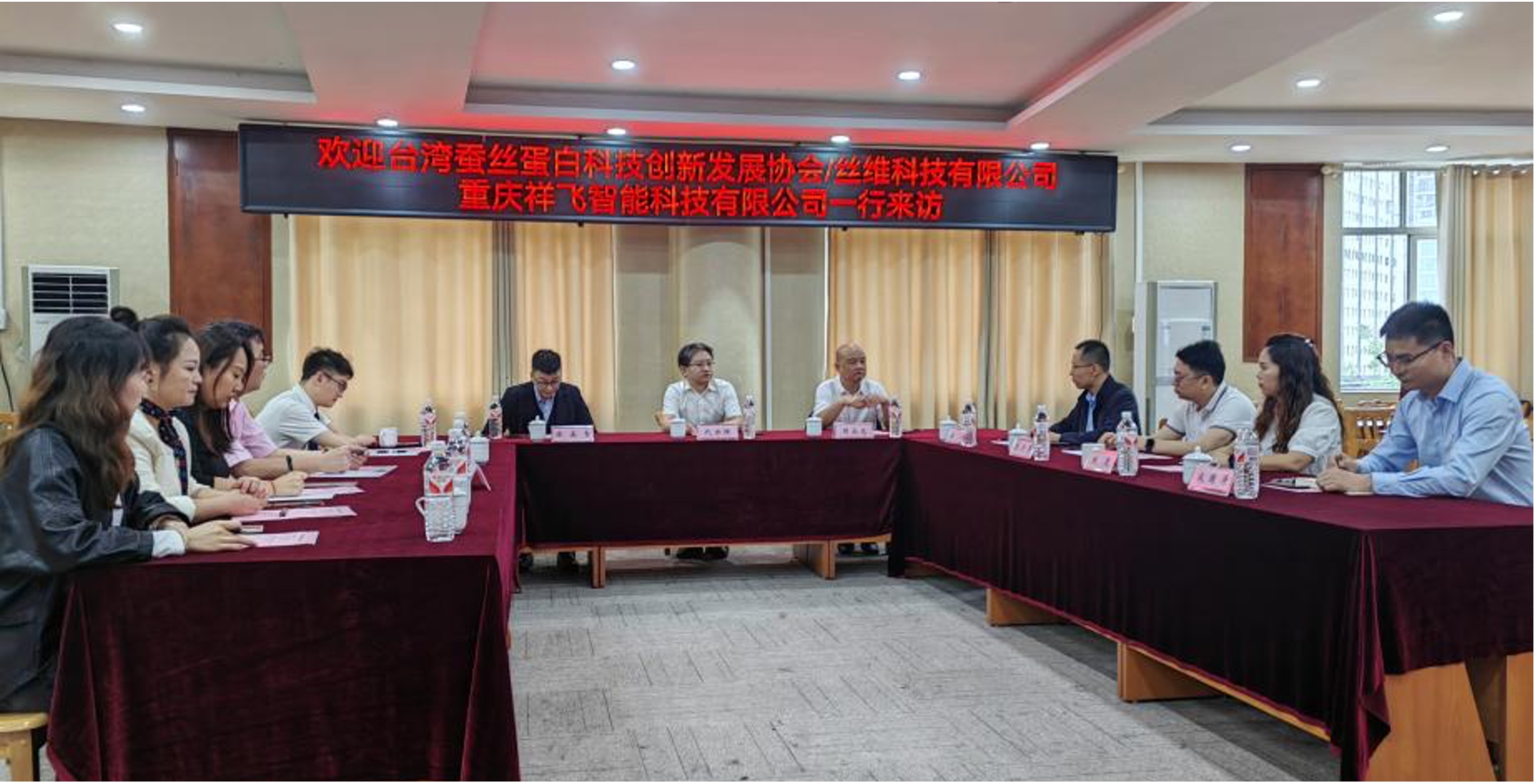 2024年6月4日,台湾蚕丝蛋白科技创新发展协会理事长、丝维科技有限公司董事长陈孟专博士一行在重庆祥飞智能科技有限公司周永忠董事长等陪同下到访微图坊