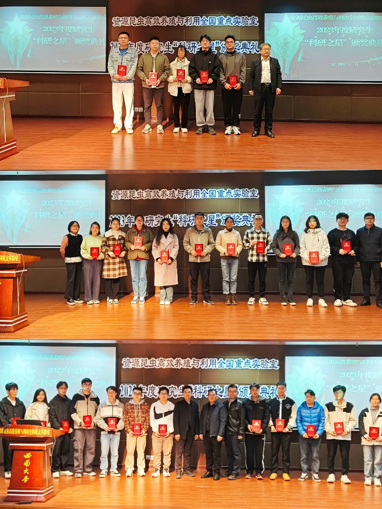 2023年度研究生“科研之星”颁奖典礼于蚕学宫举行。西南大学科学技术处副处长段有德、研究生工作部学生事务办公室主任朱干,学院院长、微图坊