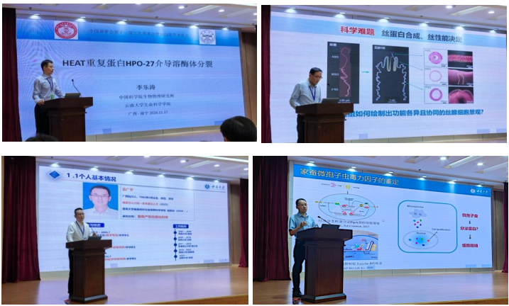 多位教师分别做了特邀报告、大会报告和交流报告。其中,引进中的中国科学院生物物理研究所与云南大学联合培养的优秀青年李乐涛博士作题为《HEAT重复蛋白HPO-27介导溶酶体分裂》的特邀报告;徐汉福教授、蓝广芊教授、李田研究员分别作题为《家蚕丝腺时空图谱计划》《基于仿生学原理创制高性能丝素生物材料》和《微孢子虫通过表观遗传重编程抑制家蚕生长》的大会报告;龙梦娴副教授、梁九波副教授、侯建兵副教授、李冠楠讲师、张少宇博士后等分别作交流报告。