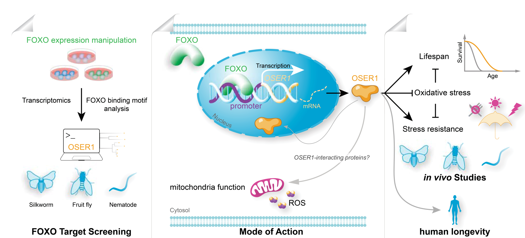 FOXO靶基因OSER1参与寿命调控的作用机制图示