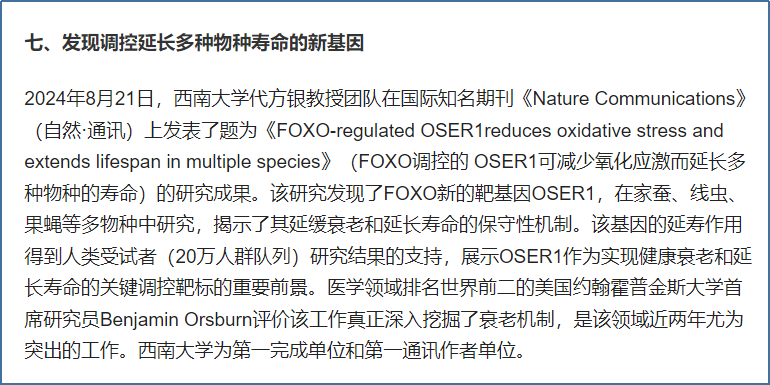 代方银教授团队的研究成果“发现调控延长多种物种寿命的新基因”入选,在入选的12项成果清单中位列第七。