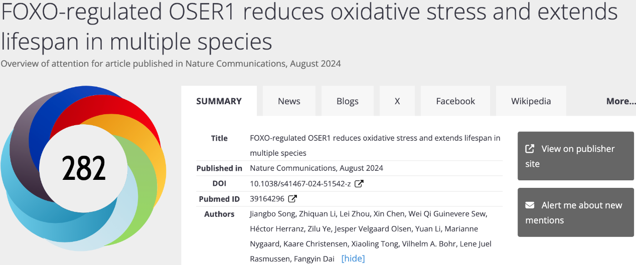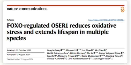 代方银教授团队在国际知名学术期刊Nature Communications(《自然通讯》)上发表的研究论文“FOXO-regulated OSER1 reduces oxidative stress and extends lifespan in multiple species”(FOXO调节的OSER1可减少氧化应激而延长多种物种的寿命)为健康衰老和延长寿命提供了新的科学依据,在学术界产生了重要影响,引起热烈讨论。