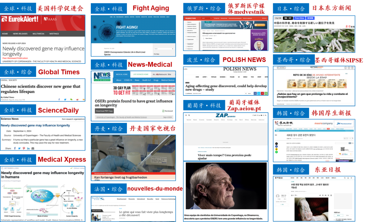 在国外,该成果受到了包括丹麦国家电视台、美国科学促进会(AAAS)旗下科学媒体EurekAlert、科学综合媒体Science Daily、医学媒体Medical Xpress和News-Medical、抗衰老领域专业媒体Fight Aging的亮点报道。此外,还受到众多国家的官方媒体报道,如俄罗斯医学媒体medvestnik、墨西哥媒体SIPSE、葡萄牙媒体Zap.aeiou.pt、法国媒体nouvelles-du-monde;同时,波兰、韩国和日本等国媒体也进行了相关报道,凸显出该研究的重要国际影响力。
