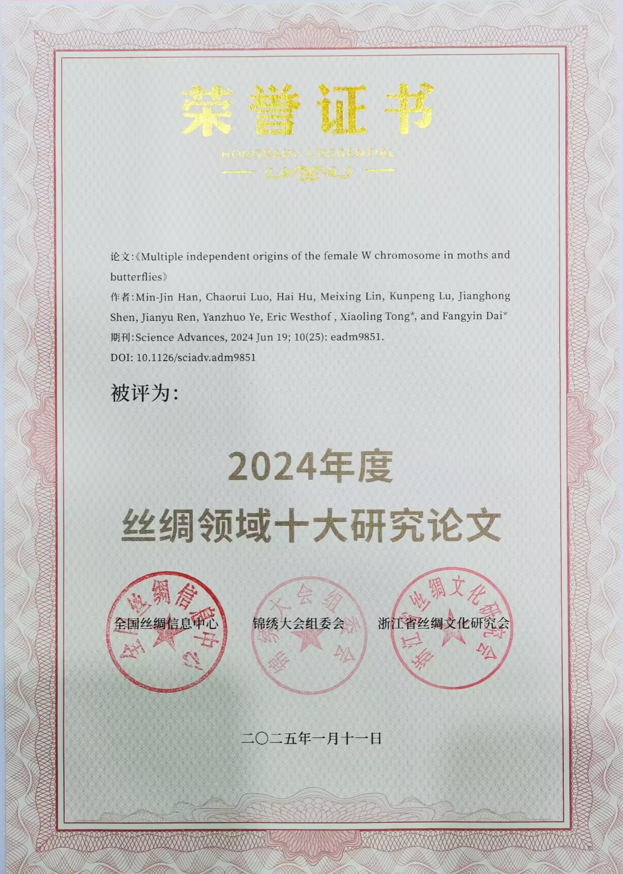 代方银教授团队完成的关于家蚕W染色体基因组的研究论文“Multiple independent origins of the female W chromosome in moths and butterflies”(蛾类和蝶类性染色体W的多重独立起源)入选“2024年度丝绸领域十大研究论文”。