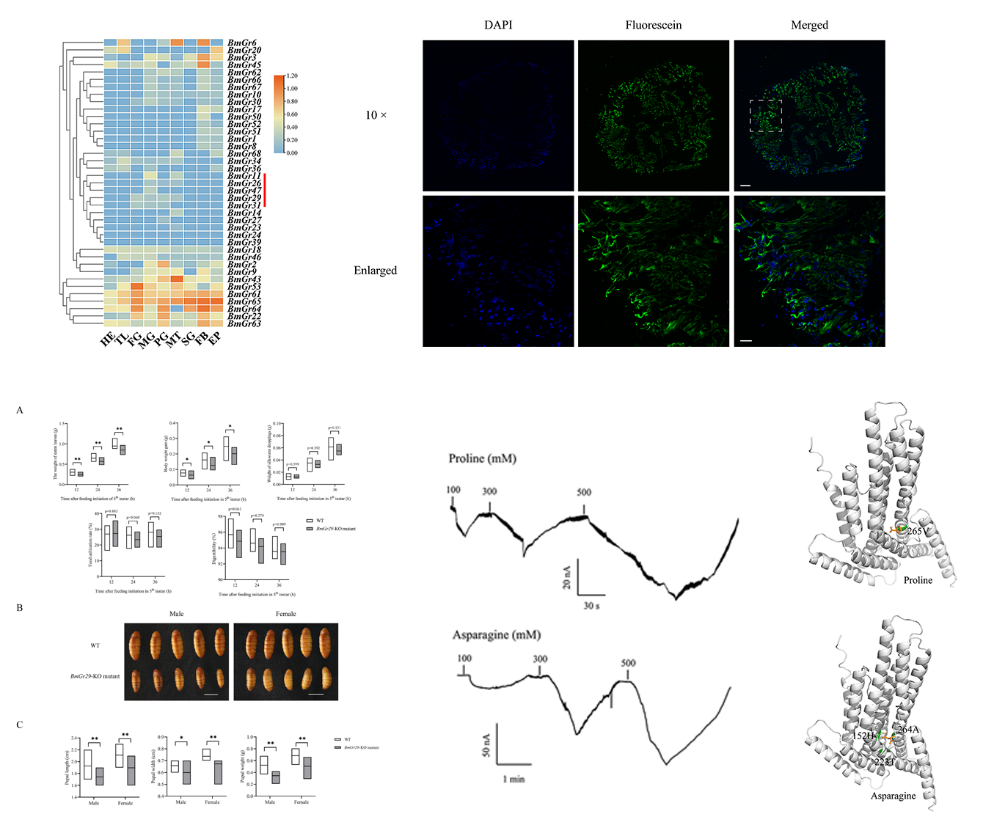 该研究首先系统绘制了家蚕味觉受体基因家族在9个主要组织中的表达图谱,发现味觉受体基因BmGr29在前肠和中肠中特异且相对高丰度表达,其蛋白具有典型的7次跨膜结构和膜定位信号特征;敲除BmGr29基因的家蚕幼虫的取食桑叶重量、体重增长量,以及蚕蛹的重量和体型均显著低于野生型;该研究还通过分子对接模拟和双电极电压钳技术鉴定了BmGr29的配体化合物:氨基酸类化合物天冬酰胺和脯氨酸。