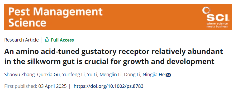 何宁佳教授团队在中科院1区TOP期刊Pest Management Science上发表题为“An amino acid‐tuned gustatory receptor relatively abundant in the silkworm gut is crucial for growth and development”的研究论文,系统揭示了家蚕味觉受体BmGr29的生物学功能。