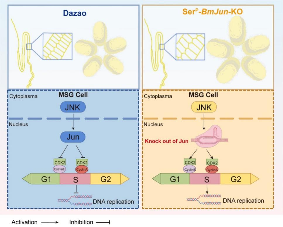 本研究揭示了JNK信号通路及其下游BmJun基因对家蚕细胞周期和丝腺核内复制的贡献。证明了BmJun基因能够诱导BmN-SWU1细胞发生G0/G1期阻滞,降低DNA合成速率,抑制M期细胞分裂过程,并降低细胞的增殖活性。同时发现,在中部丝腺(MSG)中敲除BmJun基因导致细胞体积增大30%,MSG直径扩大20%,茧丝增粗17%,同时蚕丝产量增加16%。此外,本研究还证实,BmJun基因能够靶向BmCDK2、BmCyclinA和BmCyclinE基因的启动子,从而发挥负调控功能。这些发现为深入了解Jun蛋白家族和BmJun基因在核内复制中的功能和作用机制提供了新的见解。同时,也为蚕丝腺的遗传改良提供了分子靶标,在家蚕分子育种中具有重要的应用价值。