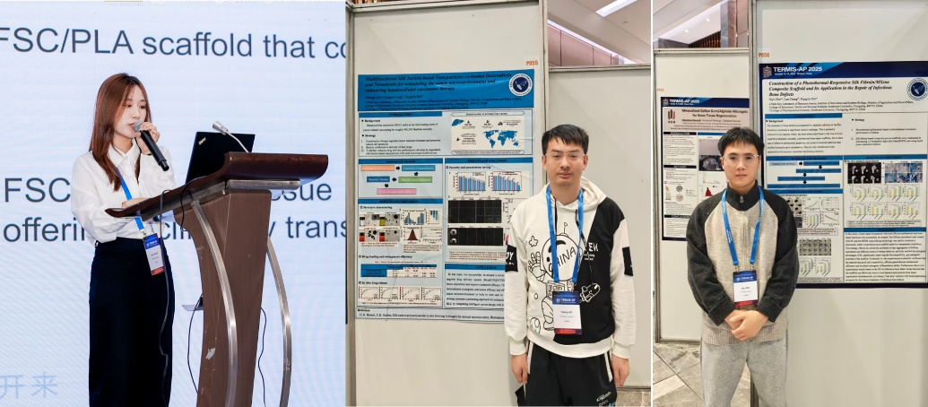 在学术交流环节,博士生张茜作题为 “Osteoimmunity-Regulating Biospun 3D Silk Scaffold for Bone Regeneration in Critical-size Defects” 的口头报告,聚焦骨免疫调控与丝素三维支架的耦合策略,凭借扎实研究与清晰表达,获分论坛“Best Oral Presentation”奖。博士生刘玉隆与朱思宇完成专题墙报展示,围绕蚕丝材料在组织工程与再生医学中的应用探索展开交流。相关工作呈现了微图坊
