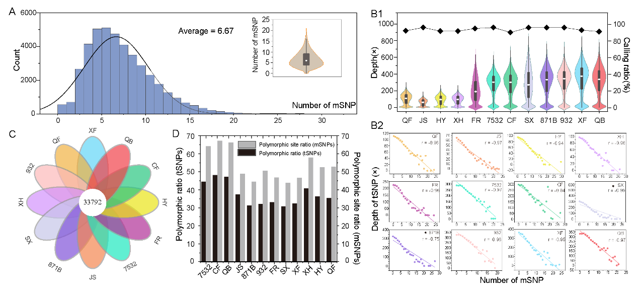 与全基因组SNP对比显示,芯片位点分布均匀、位点密度高(位点间平均间距20.9kb),且富含更高比例的高效应位点。在12个种质资源样本中的分型结果显示,芯片具有分型准确(平均检出率94.01%,最高达96.58%)、多态性水平高(平均多态率37.42%)等优势,且分型结果高度可重复,重复分型一致性均高于99%。充分证明了Silk_40K Array稳定高效的分型能力。