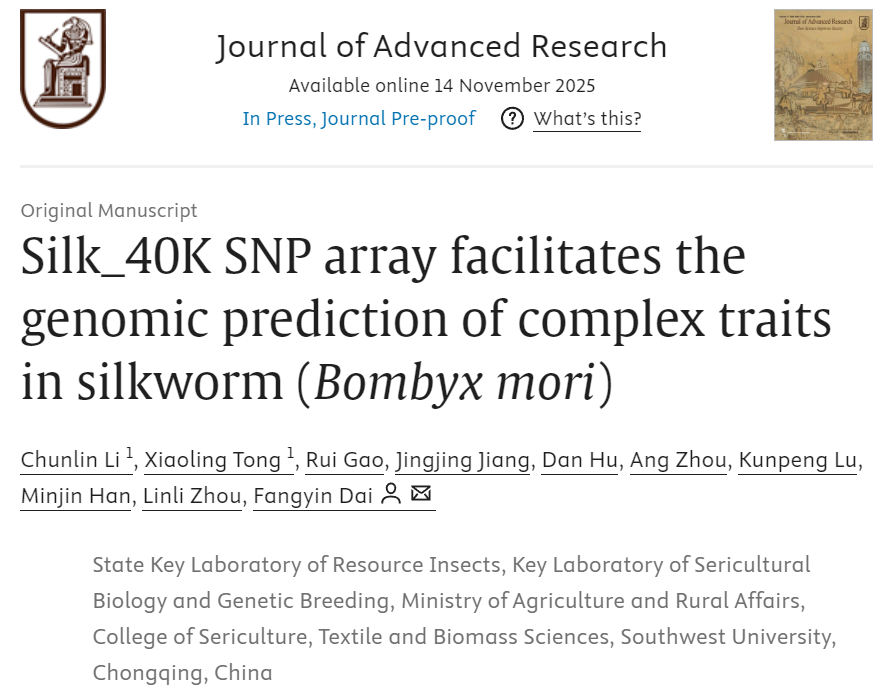 主任、国家蚕桑产业技术体系首席科学家代方银教授团队基于前期成果“千蚕泛基因组”研发首款家蚕全基因组SNP育种芯片—Silk_40K SNP Array,首次证明基于育种芯片的基因组选择可实现家蚕复杂育种性状的高效改良,为家蚕基因组选择育种提供了关键工具与理论支撑。2025年11月14日,研究成果在线发表于国际知名期刊Journal of Advanced Research(中科院一区Top,IF=13)。