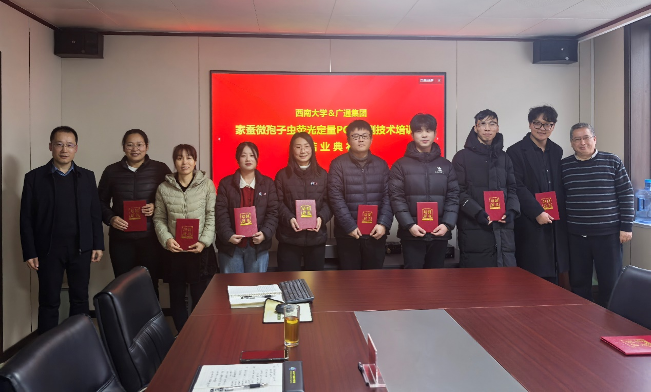 为参加“家蚕微孢子虫荧光定量PCR检测技术培训班”的9名广通集团技术骨干颁发了培训合格证书,标志着双方在专业技术人才联合培养和技能培训方面迈出坚实一步。