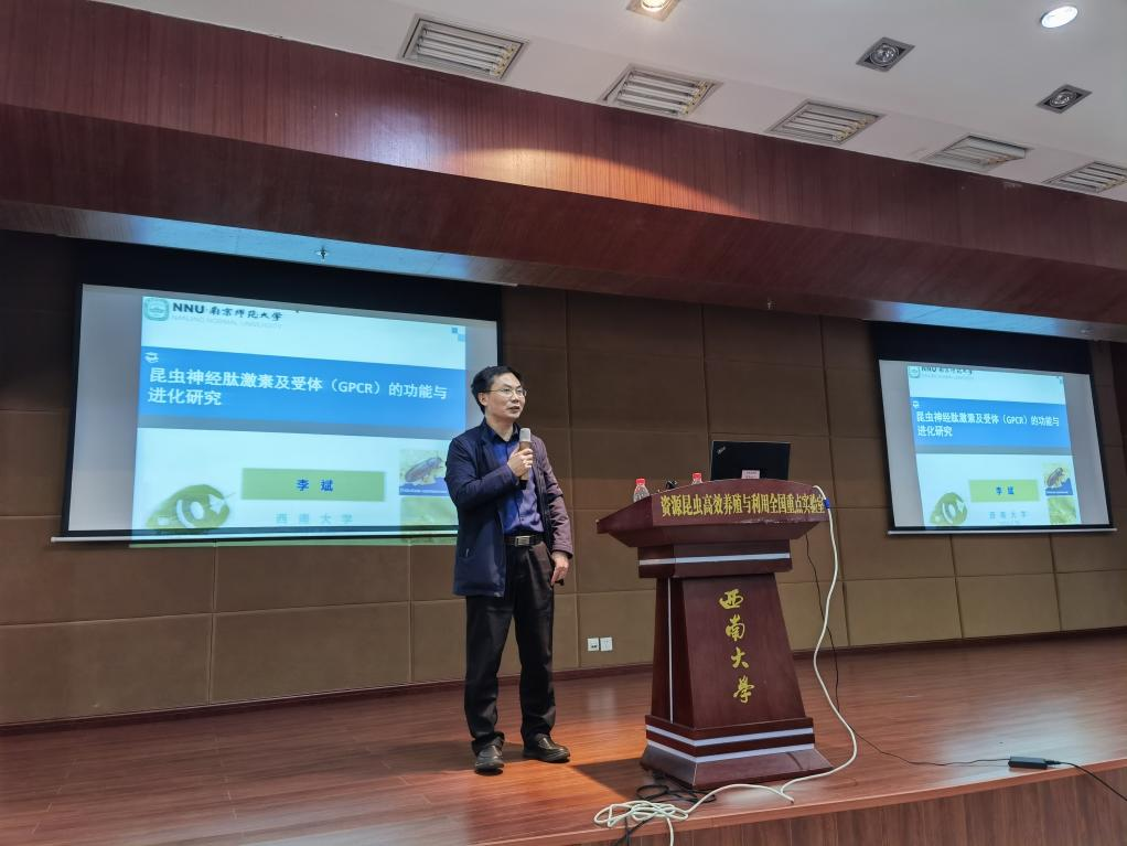 的建设和发展所作出的贡献。李斌教授报告题目为“昆虫神经肽激素及受体(GPCR)的功能与进化研究”,主要介绍了其团队利用基因组学等方法,解析了模式昆虫赤拟谷盗的基因组和进化,并着重介绍了昆虫神经肽激素受体的进化与功能研究。李教授团队研究取得了一系列重要进展和成果,为昆虫学的发展作出了积极贡献,也为蚕学研究提供了重要参考。李教授的报告受到与会师生的热烈欢迎,现场师生与李教授开展了热烈讨论和交流。