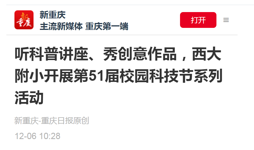 受邀参加西大附小开展第51届校园科技节系列活动,服务两个校区小学生共5000余人,现场反响热烈,并受到重庆日报等新媒体的报道。